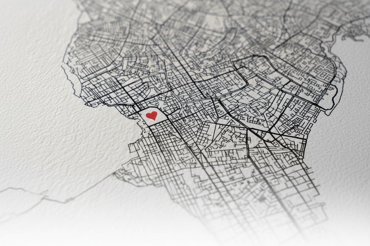 Every Where We Met print is made to order in our studio, guided by a balance of minimalist cartographic principles and emotional storytelling.